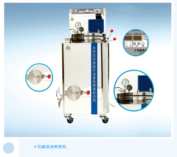 ? 東華原醫(yī)療十功能自動(dòng)煎藥機(jī)將中醫(yī)藥傳統(tǒng)文化與現(xiàn)代科學(xué)技術(shù)深度結(jié)合,具備多種先進(jìn)的中藥煎煮功能,先煎后下,滿足不同需求;自動(dòng)加熱,文武火可調(diào);數(shù)控定時(shí),無味煎藥;升溫滅菌,滑動(dòng)鍋蓋;電動(dòng)攪拌、自動(dòng)加水計(jì)量;電動(dòng)擠壓,藥渣自動(dòng)分離;自動(dòng)清洗,蒸汽冷凝,安全有保障……此外,十功能自動(dòng)煎藥機(jī)還保留了傳統(tǒng)特色,具備常壓煎煮功能,提供多元化中藥煎煮解決方案。