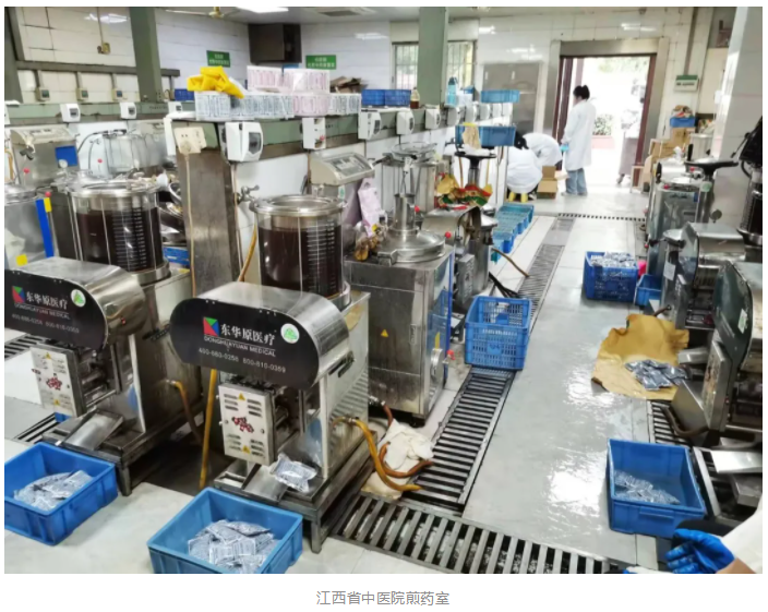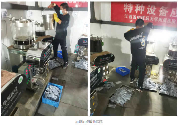 東華原南昌辦路安、黃坤雨、夏國新、鄭劍云、孫也等員工堅守一線,全天候在醫(yī)院煎藥室現(xiàn)場,保障中藥湯劑生產(chǎn)的質(zhì)量和效率。