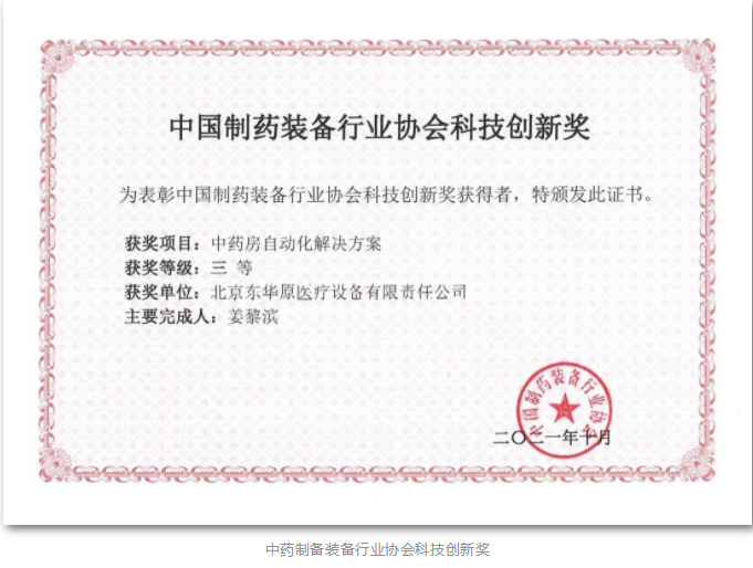 為促進(jìn)制藥裝備技術(shù)創(chuàng)新,促進(jìn)我國制藥裝備工業(yè)技術(shù)水平不斷提高,中國制藥裝備行業(yè)協(xié)會(huì)舉辦了中國制藥裝備行業(yè)協(xié)會(huì)科學(xué)技術(shù)創(chuàng)新獎(jiǎng)評(píng)選活動(dòng)。近日,中國制藥裝備行業(yè)協(xié)會(huì)公布了獲獎(jiǎng)企業(yè)名單,授予在制藥技術(shù)研究、開發(fā)創(chuàng)新等方面有突出成績的企業(yè)單位榮譽(yù)證書。東華原醫(yī)療“中藥房自動(dòng)化解決方案”榮獲中國制藥裝備行業(yè)協(xié)會(huì)科技創(chuàng)新三等獎(jiǎng)。