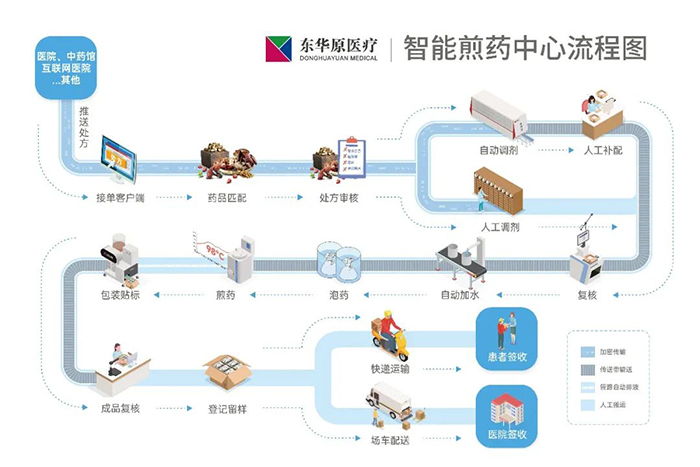 智慧中藥房智能控制管理系統(tǒng)運用計算機控制、物聯(lián)網(wǎng)及互聯(lián)網(wǎng)技術(shù),以智能調(diào)劑系統(tǒng)、智能復核設(shè)備、自動化運輸系統(tǒng)、自動加水系統(tǒng)、煎藥包裝設(shè)備、打印設(shè)備等為基礎(chǔ),將煎藥工藝流程(包括接方、調(diào)劑、復核、泡藥、煎藥、包裝、成品復核、發(fā)貨)、終端客戶、設(shè)備和人員、工藝質(zhì)量等環(huán)節(jié)進行全過程數(shù)據(jù)可溯源管理與控制而形成的一種創(chuàng)新智能控制系統(tǒng)。
