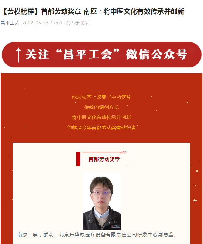 此前,在五一勞動(dòng)節(jié)之際,北京市總工會(huì)召開(kāi)2022年“五一”新聞發(fā)布會(huì),北京東華原醫(yī)療設(shè)備有限責(zé)任公司南原同志榮獲“首都勞動(dòng)獎(jiǎng)?wù)隆?。昌平工?huì)以“凝心聚力,砥礪前行”為題,做了勞動(dòng)者風(fēng)采專題報(bào)道。