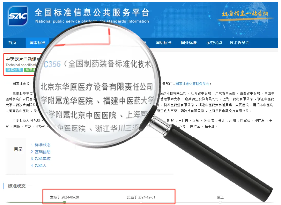 5月28日,東華原參與起草的國家標準《中藥飲片自動調(diào)劑系統(tǒng)技術規(guī)范》 列入國家標準規(guī)范 ,主管部門為國家標準化管理委員會。將于12月1日開始實施。