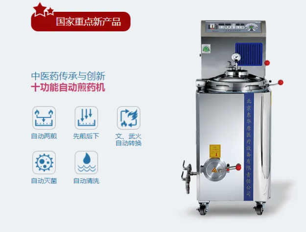十功能自動煎藥機(jī),是東華原于2008年,承接國家中醫(yī)藥管理局及知名中醫(yī)藥專家的聯(lián)合委托,研制開發(fā)的符合中醫(yī)藥傳統(tǒng)的新型中藥煎藥機(jī),具備先煎后下、自動兩煎、文武火轉(zhuǎn)換、自動循環(huán)、自動擠壓等十余項功能。是國家中醫(yī)藥管理局首批推薦的中醫(yī)診療設(shè)備,先后榮獲國家重點新產(chǎn)品、中國好技術(shù)、北京市新技術(shù)新產(chǎn)品(服務(wù))等多項殊榮,也成為了各中醫(yī)醫(yī)院、綜合醫(yī)院、代煎中心、中醫(yī)門診等中藥煎藥服務(wù)單位的最佳選擇。