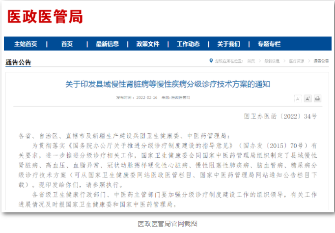 近日,國(guó)家衛(wèi)生健康委辦公廳、國(guó)家中醫(yī)藥管理局印發(fā)《縣域高血壓分級(jí)診療技術(shù)方案》(以下簡(jiǎn)稱方案),為各縣域醫(yī)療機(jī)構(gòu)更好的落實(shí)自身功能定位,為高血壓患者提供一體化、高質(zhì)量的醫(yī)療服務(wù),改善患者生存質(zhì)量、有效降低國(guó)家和患者的疾病負(fù)擔(dān)提供助力。