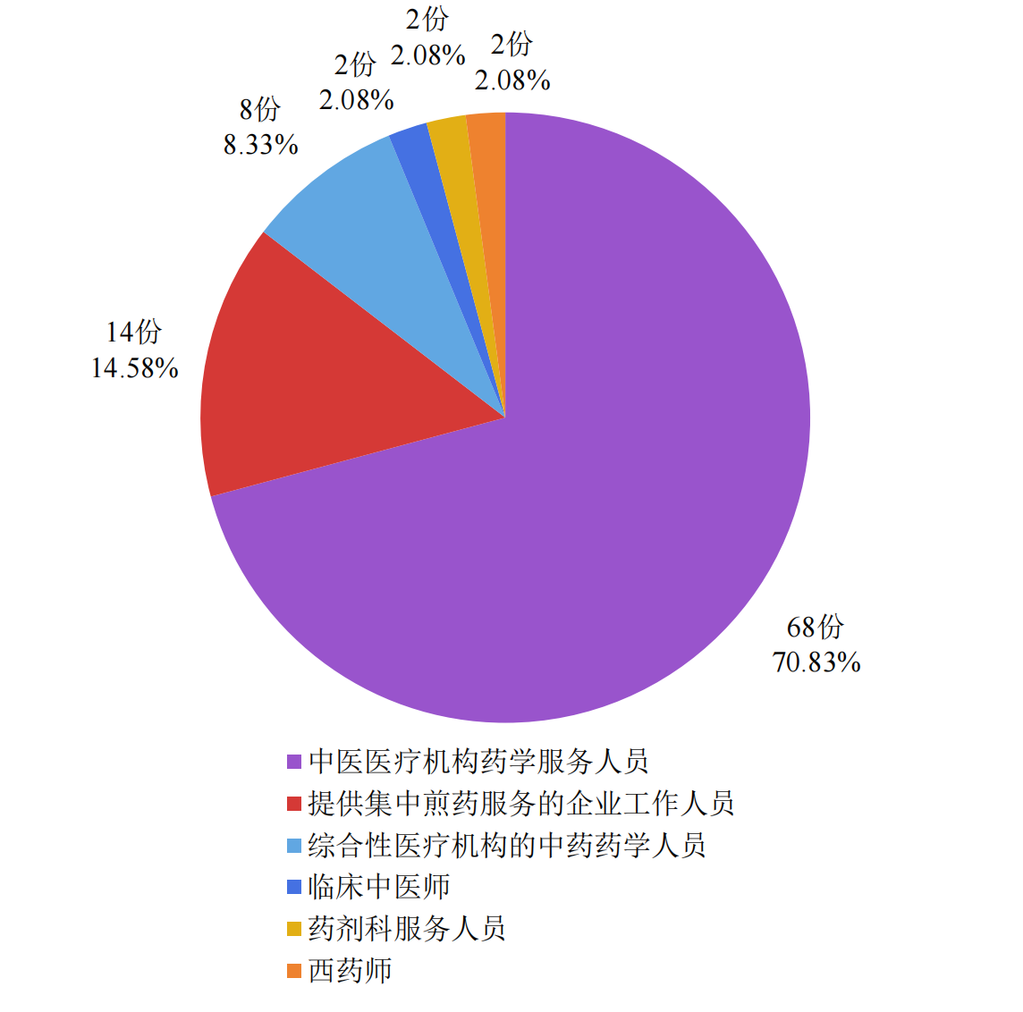 本次調(diào)研的樣本主要來自基層社區(qū)衛(wèi)生服務(wù)中心或衛(wèi)生院51份(占比57.95%)、醫(yī)療機(jī)構(gòu)24份(占比27.27%)和中藥集中煎煮企業(yè)13份(占比14.77%)。其中,中醫(yī)醫(yī)療機(jī)構(gòu)的藥學(xué)服務(wù)人員占比70.83%,反映出本次調(diào)研對象具有較為豐富的工作經(jīng)驗(yàn),能夠較好地提供有關(guān)中藥湯劑煎煮與監(jiān)管的相關(guān)認(rèn)知信息。(見圖4、表1)