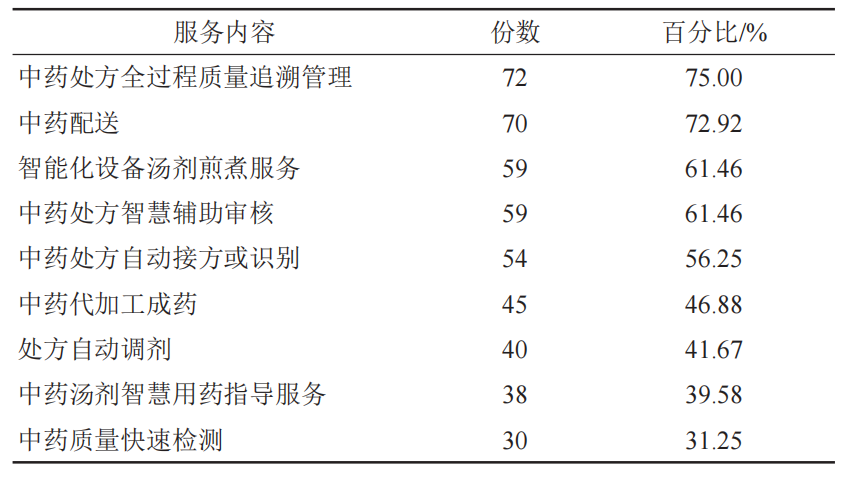 調(diào)查顯示,杭州市多數(shù)機(jī)構(gòu)已基本實(shí)現(xiàn)中藥處方全過程質(zhì)量追溯管理(75%),并通過智能設(shè)備提供煎煮服務(wù)(72.92%)。然而,湯劑智慧用藥指導(dǎo)服務(wù)和中藥湯劑質(zhì)量快速檢測的實(shí)施仍較為薄弱,分別只有39.58%和31.25%的機(jī)構(gòu)表示有相關(guān)服務(wù)或檢測能力。