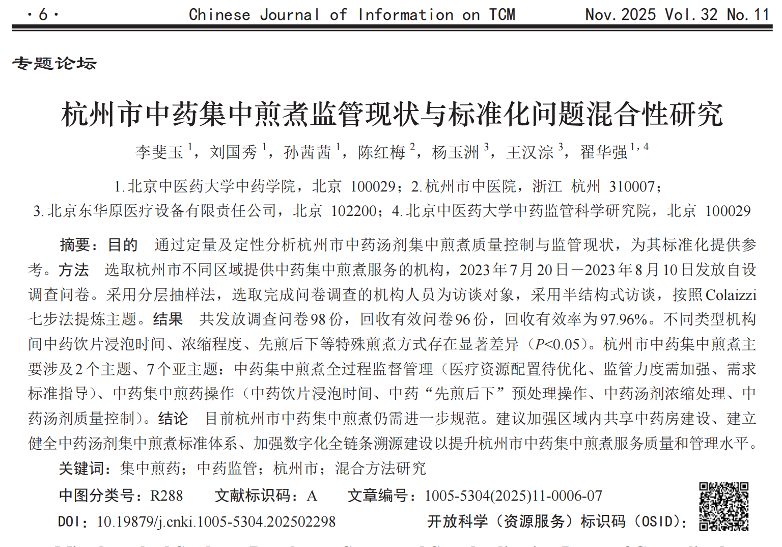 學(xué)術(shù)前沿 | 杭州市中藥集中煎煮監(jiān)管現(xiàn)狀與標(biāo)準(zhǔn)化問題混合性研究