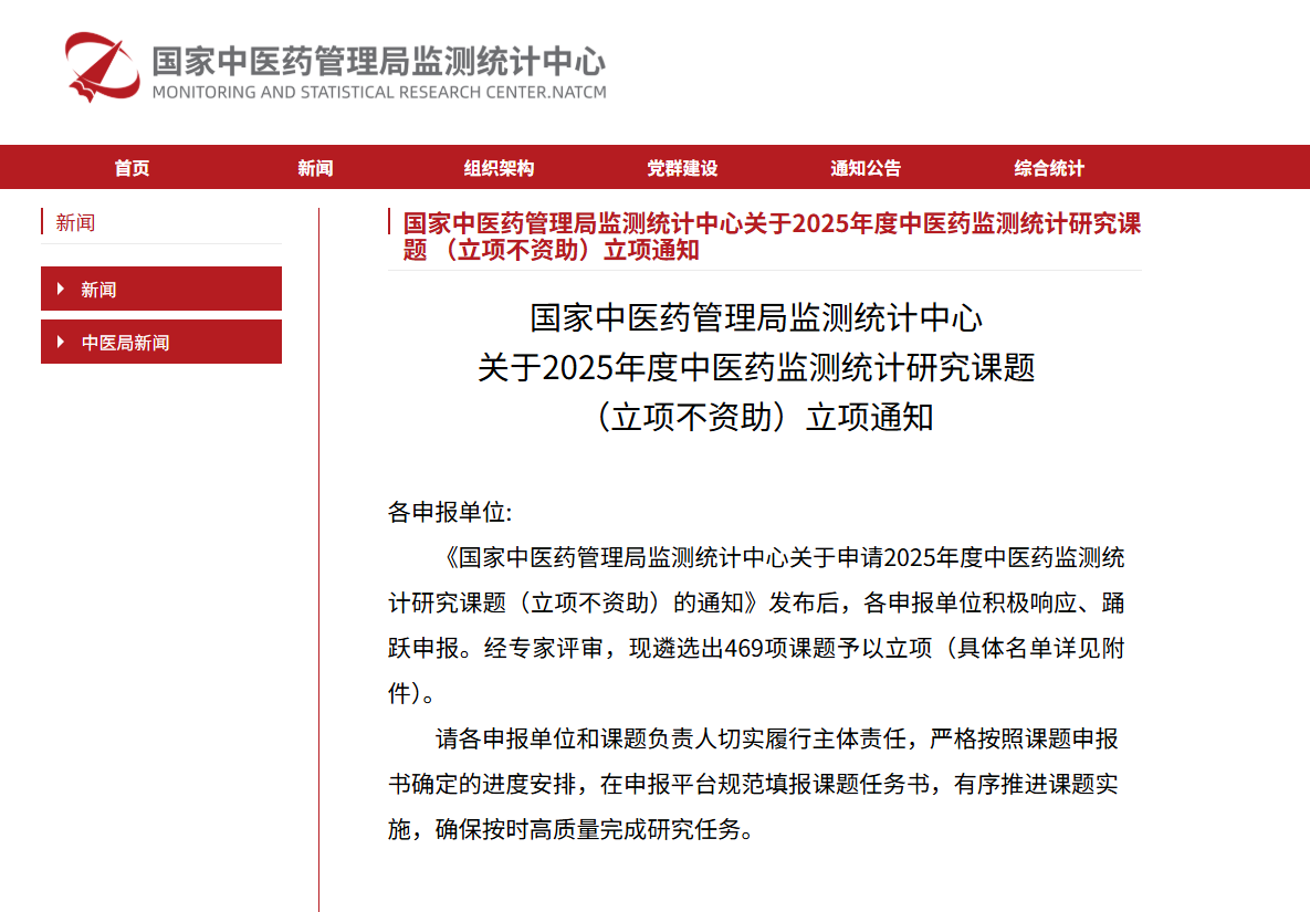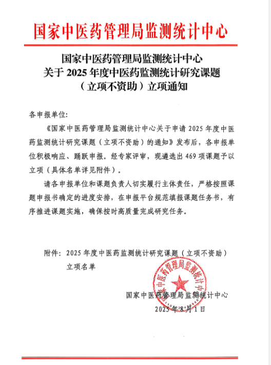 近日,國(guó)家中醫(yī)藥管理局監(jiān)測(cè)統(tǒng)計(jì)中心發(fā)布了《國(guó)家中醫(yī)藥管理局監(jiān)測(cè)統(tǒng)計(jì)中心關(guān)于2025年度中醫(yī)藥監(jiān)測(cè)統(tǒng)計(jì)研究課題(立項(xiàng)不資助)立項(xiàng)通知》。東華原申報(bào)的4項(xiàng)課題通過審批,成功立項(xiàng)。