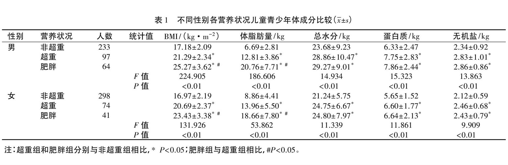2.1 不同營養(yǎng)狀況兒童青少年體成分比較 807 名中小學(xué)生中,非超重組531 名,占65.8%,其中男生233名,女生 298 名;超重組 171 名,占 21.2%,其中男生 97名,女生 74 名;肥胖組 105 名,占 13.0%,其中男生 64名,女生 41 名。經(jīng)正態(tài)分布檢驗,男、女生不同營養(yǎng)狀況的體成分均符合正態(tài)分布。由表1 可見,男、女生不同營養(yǎng)狀況組間體成分差異均有統(tǒng)計學(xué)意義(P 值均<0.01)。兒童青少年的 BMI、體脂肪量、總水分、蛋白質(zhì)、無機(jī)鹽均值均為肥胖組、超重組>非超重組,不論男女,差異均有統(tǒng)計學(xué)意義(t 男 值分別為 - 17. 102,- 14. 341,-4.307,-4.385,-4.088,-14.969,-14.129,-4.235,-4.290,-4.094;t 女 值分別為 11.901,7.876,2.765,2.852,2.470,12.846,7.406,4.552,4.649,4.315,P 值均<0.05);肥胖組和超重組相比,除女生的無機(jī)鹽含量均值超重組>肥胖組,其他均為肥胖組>超重組,但是僅 BMI 和體脂肪量差異均有統(tǒng)計學(xué)意義(t 男 值分別為 -7.780,-7.646;t 女 值分別為 -5.096,-3.771,P 值均<0.05)。