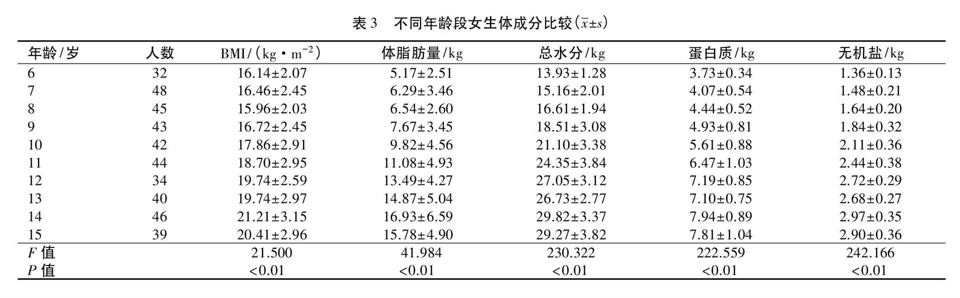 由表 2~3 可見,男、女生的 BMI 逐年增長,差異均有統(tǒng)計學(xué)意義(P 值均<0.01);男生每個年齡段的 BMI都高于女生,僅 8,12,13,15 歲的差異均有統(tǒng)計學(xué)意義(t 值分別為 4.141,2.167,3.261,2.348,P 值均<0.05)。男生 6~12 歲階段的體脂肪量逐年增加,13 歲開始逐年減少,女生的體脂肪量逐年增加,差異均有統(tǒng)計學(xué)意義(P 值均<0.01);12 歲之前男生體脂肪量均值大于女生,13 歲以后體脂肪量均值小于女生,其中8,14,15 歲的差異均有統(tǒng)計學(xué)意義(t 值分別 3.321,-3.882,-2.359,P 值均<0.05)。男、女生的總水分、蛋白質(zhì)、無機(jī)鹽均值逐年增加,差異均有統(tǒng)計學(xué)意義(P 值均<0.01);男生每個年齡段以上 3 種體成分的均值都大于女生,其中 8,13,14,15 歲的差異均有統(tǒng)計學(xué)意義(t 值分別為 4.232,10.064,11.202,10.738,P 值均<0.05)。