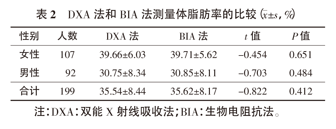 2.1 BIA 與DXA 測量體脂肪率的比較DXA 和BIA測得的女性、男性及全部受檢人員的體脂肪率的差異均無統(tǒng)計學(xué)意義(t 值分別為-0.454、-0.703 和-0.822,P>0.05),見表2。