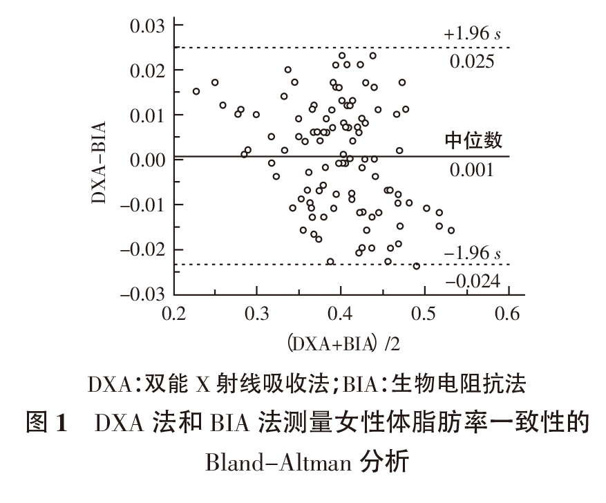 結(jié)果 通過配對t 檢驗發(fā)現(xiàn),DXA 法和BIA 法測得的女性、男性及全體受檢者的體脂肪率的差異均無統(tǒng)計學(xué)意義(P>0.05);通過相關(guān)分析發(fā)現(xiàn),DXA 和BIA 測量女性、男性及全體受檢者體脂肪率的r 值分別為0.960 4、0.973 4 和0.976 9,有統(tǒng)計學(xué)意義(P<0.01),具有較高的相關(guān)性;通過Bland-Altman分析發(fā)現(xiàn),2 種方法測得的女性、男性及全體受檢者的體脂肪率均具有較強(qiáng)的一致性。結(jié)論BIA 和DXA 測量體脂肪率的相關(guān)性和一致性較好,BIA 法在人群篩查中有較好的應(yīng)用價值。