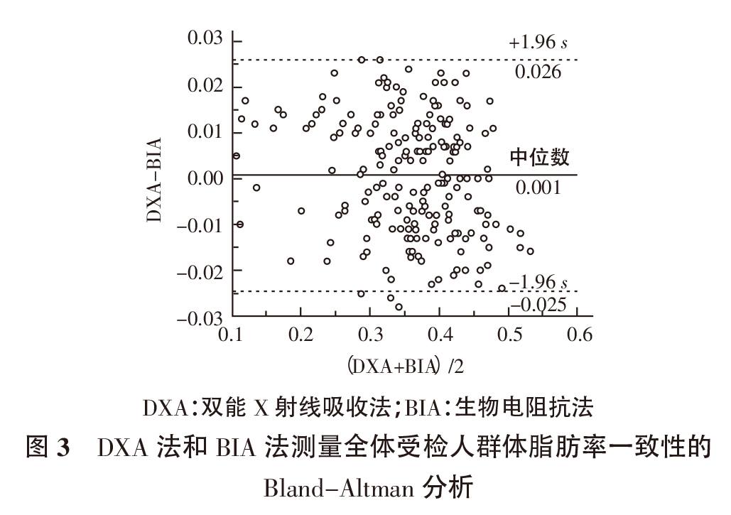 2.3 BIA 與DXA 測量體脂肪率的一致性分析由圖1 可見,107 個點中只有1 個位于一致性界限范圍以外,比例為0.94%,小于5%。在一致性界限范圍內(nèi),人體成分分析儀的BIA與DXA 測量結(jié)果差值的絕對值最大為0.024,2種方法測量女性體脂肪率的平均值為0.397,這種相差的幅度在臨床上可以接受,因此,可以認(rèn)為,2種方法測量的結(jié)果具有較好的一致性。由圖2 可見,92 個點中有2個位于一致性界限范圍以外,比例為2.17%,小于5%。在一致性界限范圍內(nèi),BIA 與DXA 測量結(jié)果差值的絕對值最大為0.028,2種方法測量男性體脂肪率的平均值為0.310,這種相差的幅度在臨床上可以接受,因此,可以認(rèn)為2 種方法測量的結(jié)果具有較好的一致性。由圖3 可見,199 個點中只有3 個位于一致性界限范圍以外,比例為1.51%,小于5%。在一致性界限范圍內(nèi),BIA 與DXA 測量結(jié)果差值的絕對值最大為0.028,2 種方法測量全體人群體脂肪率的平均值為0.360,這種相差的幅度在臨床上可以接受,因此,可以認(rèn)為2 種方法測量的結(jié)果具有較好的一致性,2種方法在臨床上測量脂肪率時可以互相代替使用。