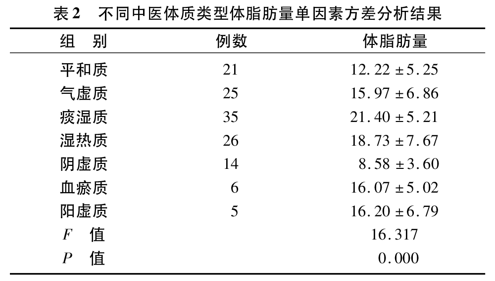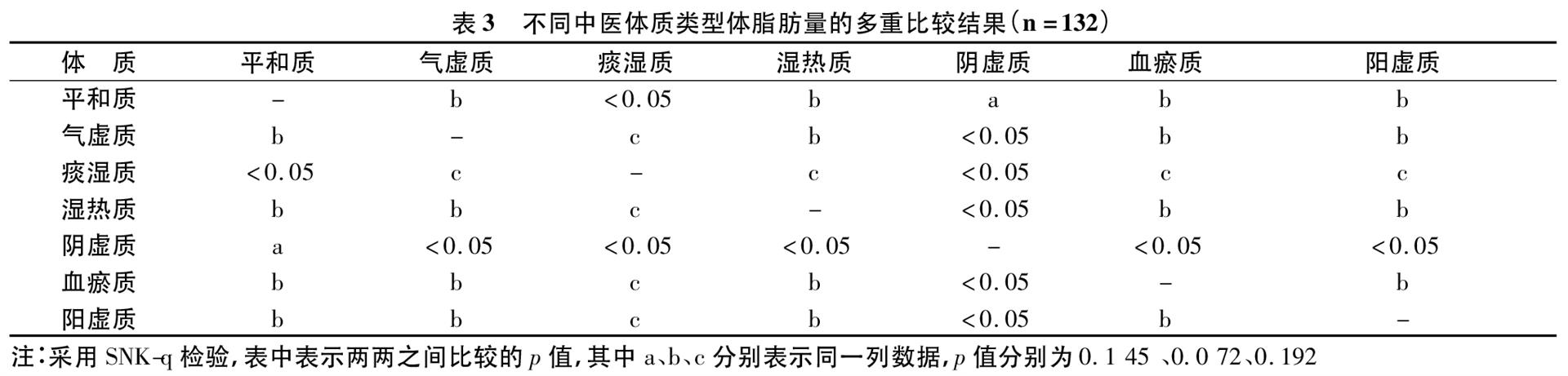 表3 顯示,體脂肪量均值從小到大的順序為陰虛質(zhì)、平和質(zhì)、氣虛質(zhì)、血瘀質(zhì)、陽虛質(zhì)、濕熱質(zhì)、痰濕質(zhì),說明痰濕質(zhì)人群體脂肪量含量最高,陰虛質(zhì)人群含量最低。組間比較,平和質(zhì)和痰濕質(zhì)、陰虛質(zhì)和氣虛質(zhì)、陰虛質(zhì)和痰濕質(zhì)、陰虛質(zhì)和濕熱質(zhì)、陰虛質(zhì)和血瘀質(zhì)、陰虛質(zhì)和陽虛質(zhì)比較差異有統(tǒng)計學意義。