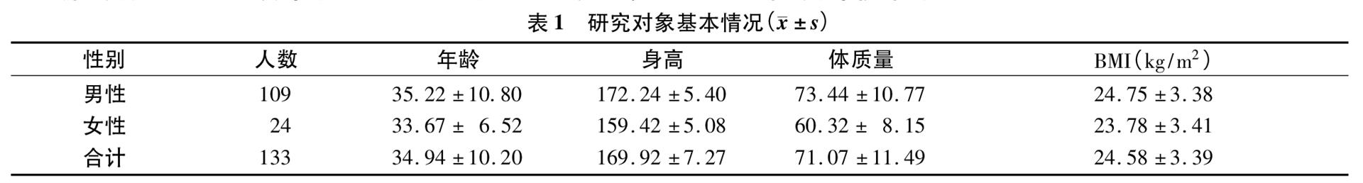 表1 顯示,選取2016 年1 月4 日至2016 年1月23 日健康體檢企業(yè)員工157 名,年齡18 ~ 60 歲,排除重要臟器病史、精神類疾病和代謝性疾病,排除佩戴人工心肺機、人工心臟等體內(nèi)移植型醫(yī)療用具者; 排除帶環(huán)的女士、生理期女性及孕婦; 排除病情嚴重者及因文化程度等原因不能理解調(diào)查問卷內(nèi)容者。所有人員均在知情的情況下參與此次臨床檢測,最終133 例志愿者數(shù)據(jù)有效,其中男性109 人,女性24 人。
