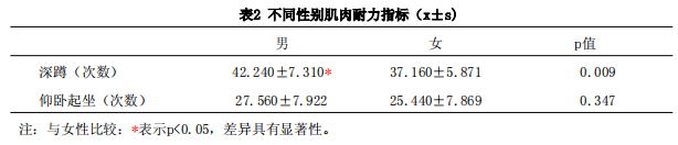 從久坐人群肌肉耐力指標(biāo)測試結(jié)果可以看出(表2),男性久坐人群深蹲次數(shù)顯著高于女性。而性別在仰臥起坐次數(shù)指標(biāo)上差異不顯著。