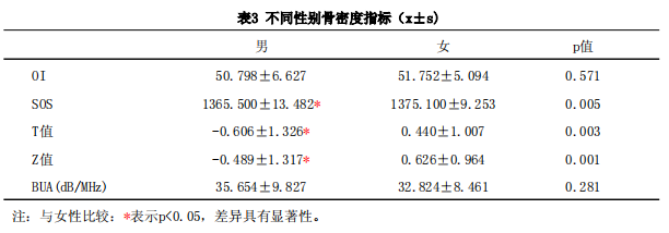 從久坐人群骨密度指標(biāo)測試結(jié)果可以看出(表3),女性久坐人群超聲波骨密度、T值和Z值三個指標(biāo)上均顯著高于男性(p<0.05)。
