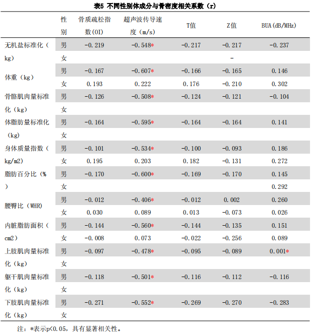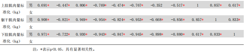 由表5可以看出,久坐人群男性的超聲波傳導(dǎo)速度與無機鹽、體重、骨骼肌肉量、體脂肪量、身體質(zhì)量指數(shù)、脂肪百分比、腰臀比、內(nèi)臟脂肪面積、上肢肌肉量、軀干肌肉量、下肢肌肉量這些體成分指標(biāo)之間存在一定的負(fù)相關(guān)(p<0.05);久坐人群女性的各項骨密度與體成分各項指標(biāo)相關(guān)關(guān)系不顯著(p>0.05)。