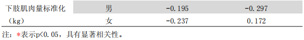 由表6可以看出,久坐人群男女的骨密度指標(biāo)和肌肉耐力指標(biāo)均無顯著性相關(guān)(p>0.05)。