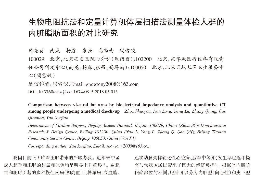 生物電阻抗法和定量計(jì)算機(jī)體層掃描法測(cè)量體檢人群的內(nèi)臟脂肪面積的對(duì)比研究