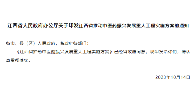 - 江西省人民政府办公厅关于印发江西省推动中医药振兴发展重大工程实施方案的通知