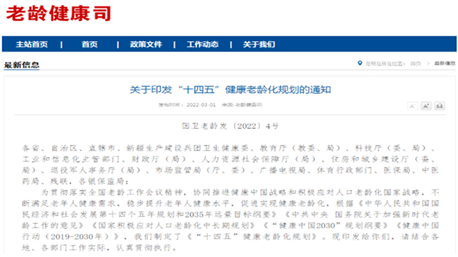 - “十四五”健康老龄化规划“十四五”时期是我国全面建设社会主义现代化国家新征程的第一个五年,也是积极应对人口老龄化的重要窗口期,促进健康老龄化将进入新的发展阶段。为协同推进健康中国战略和积极应对人口老龄化国家战略,不断满足老年人健康需求,稳步提升老年人健康水平,根据《中华人民共和国国民经济和社会发展第十四个五年规划和2035年远景目标纲要》《中共中央 国务院关于加强新时代老龄工作的意见》《国家积极应对人