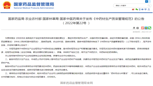 - 为贯彻落实《中共中央 国务院关于促进中医药传承创新发展的意见》,推进中药材规范化生产,加强中药材质量控制,促进中药高质量发展,依据《中华人民共和国药品管理法》《中华人民共和国中医药法》,国家药监局、农业农村部、国家林草局、国家中医药局研究制定了《中药材生产质量管理规范》(以下称本规范),现予发布实施,并将有关事项公告如下: 一、本规范适用于中药材生产企业规范生产中药材的全过程管理,是中药材规范化生