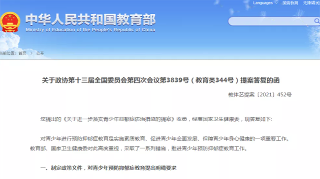 - 日前,关于政协《关于进一步落实青少年抑郁症防治措施的提案》,教育部进行了答复。其中,明确将抑郁症筛查纳入学生健康体检内容,建立学生心理健康档案,评估学生心理健康状况,对测评结果异常的学生给予重点关注。多渠道推进青少年抑郁症防治工作(一)加强抑郁症防治工作部署。2016年原国家卫生计生委、中央宣传部、中央综治办、民政部、教育部等22个部门共同印发《关于加强心理健康服务的指导意见》(国卫疾控发〔2016〕77号